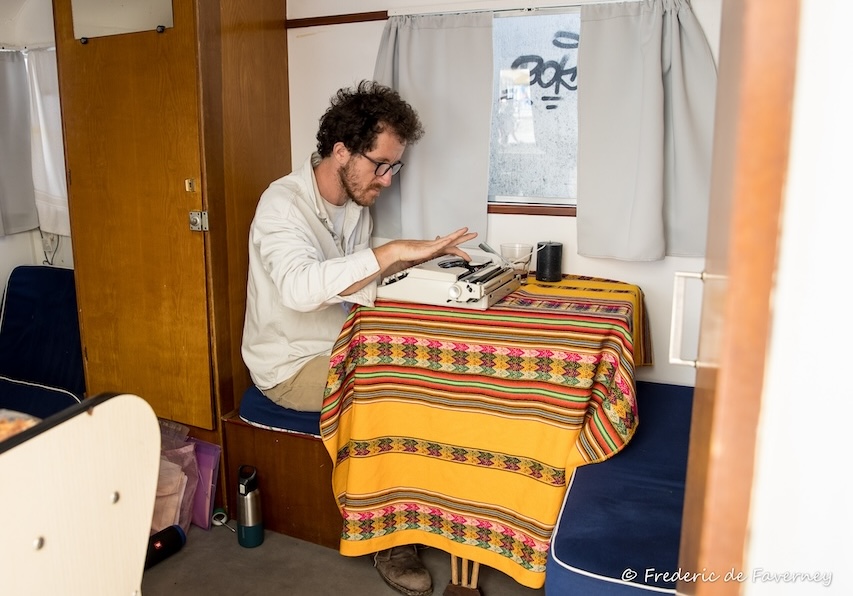 Tristan Blumel vit et travaille à Nice après de larges vadrouilles. Engagé dans la création qui va du jeu sur papier à la performance orale, il œuvre sans cesse pour que la poésie ait une plus large présence dans l’espace contemporain. “J’essaye de répondre au besoin concret de poésie. Des mots sympas, originaux, intelligents, ou parfois mieux des mots pour dire ce qu’il serait compliqué de dire autrement. Avec du sens flou, du son fou, du papier.” Tu passes ta commande. Tu repasses plus tard. Ton poème est prêt.