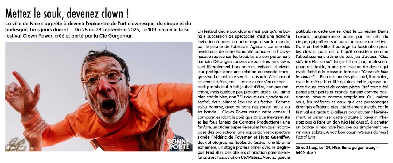 Dans le cadre du festival Clown Power, Panda-Events, Cie Gorgomar, en collaboration avec le 109 et la ville de Nice présentent